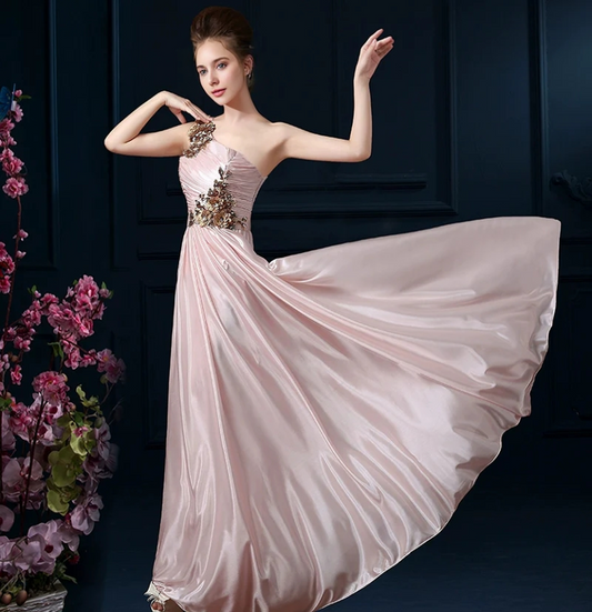This evening dress is truly stunning. The delicate pink colour is as sweet and charming as a peach blossom in spring, exuding a romantic and gentle atmosphere. The sequins embellished on the skirt, glittering in the light, as if the stars falling between the skirt, so that the wearer is like a fairy walking in the spotlight, radiant. The delicate bow behind the back, but also for the whole modelling to add a playful and dynamic, like a beautiful butterfly stationed, giving people endless reverie. It is simply tailor-made for all kinds of evening parties and birthday parties. When wearing it in those joyful occasions, it will surely become the focus of attention of the whole audience, and it will be a perfect blend of feminine softness, elegance and playfulness, showing unique charm and elegance, making every moment extra sparkling and unforgettable.
