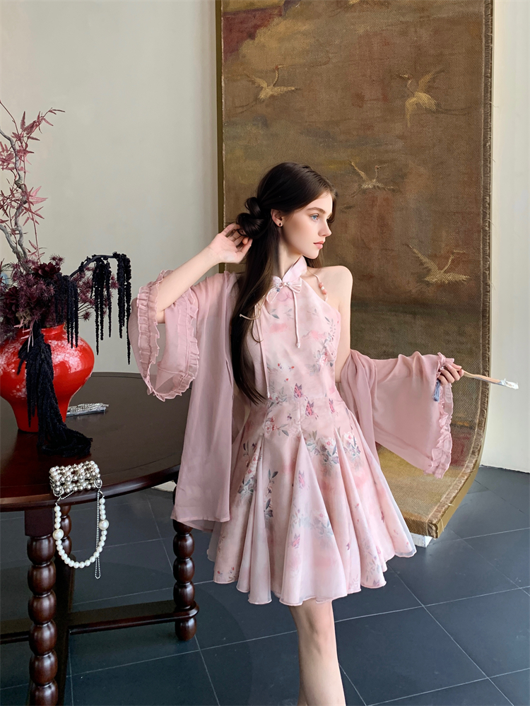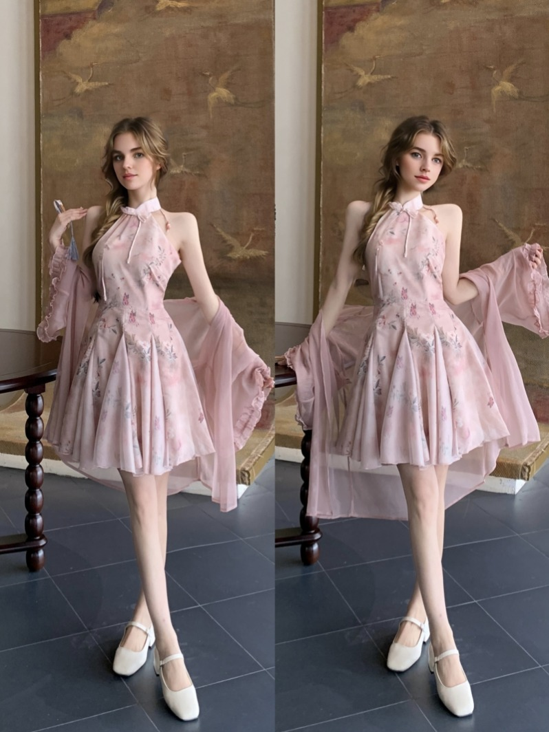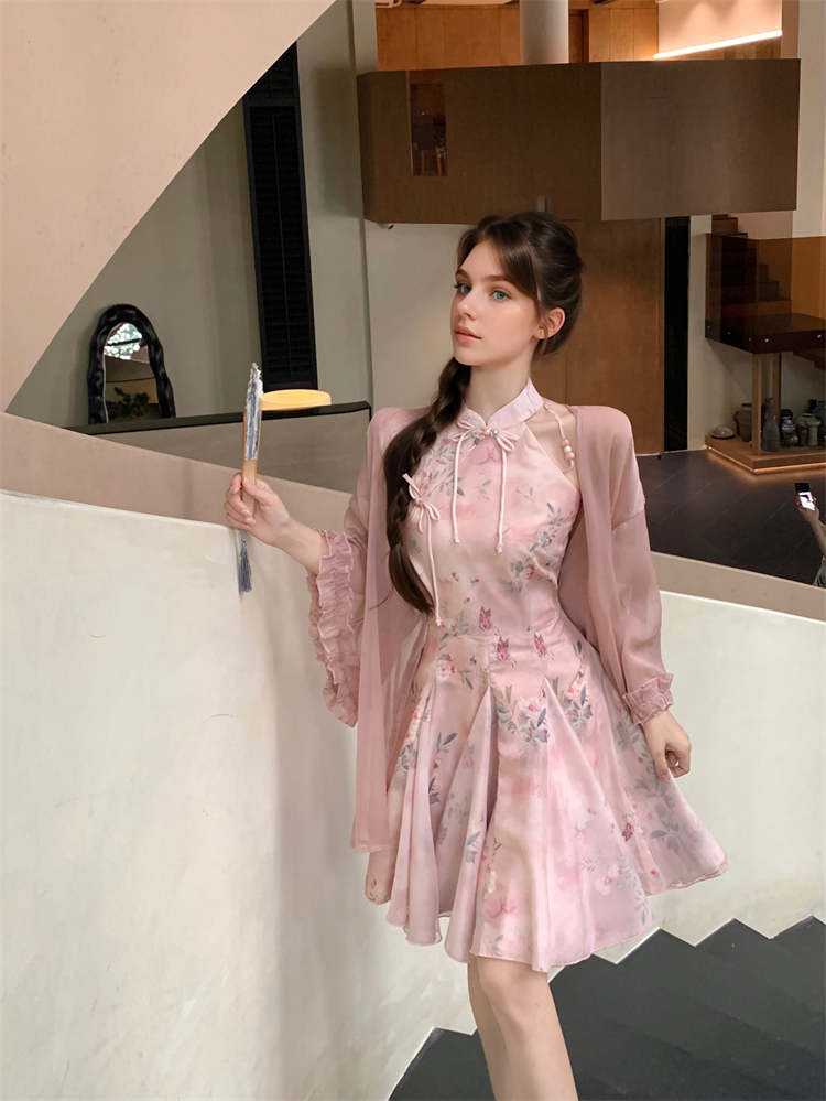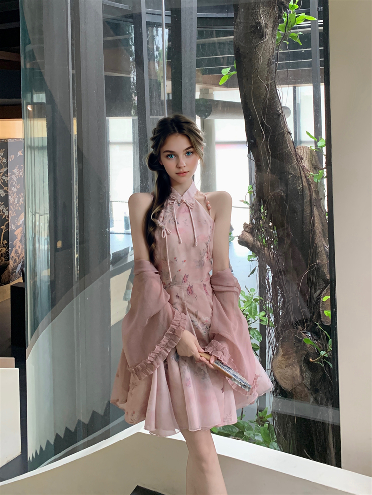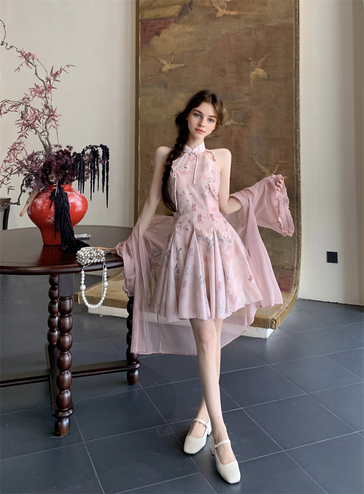 Pink Printed Irregular Patchwork Hanging Neck Cheongsam Dress Pink Tunic Top
